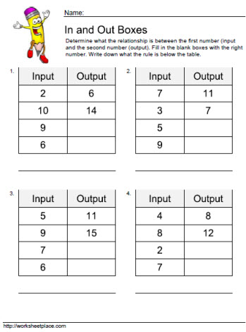 In and Out Worksheets - Math Worksheets 4 Kids In and out worksheets help kids of grade 2 through grade 6 to learn the basics of function. It also helps in understanding patterns. These printable in-out boxes worksheets cover the basic skills in adding, subtracting, multiplying or dividing the whole numbers, integers and decimals. Browse through some of these pdfs for free!
